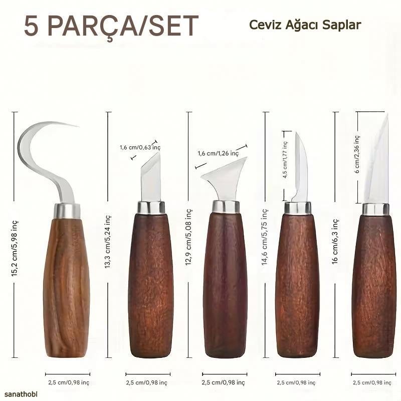 Ahşap oyma bıçağı seti 5'li, ceviz ağacı saplı, karbon çelik, zarif ve dayanıklı, yontma, ahşap İşleme. Ürün ölçüleri ek resimde mevcuttur. 5 adet farklı bıçak gönderilecektir.