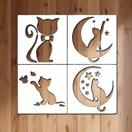 4 Adet Sevimli Kedi Şablonu, Yeniden Kullanılabilir, Duvar Boyama, Kumaş Boyama, Cam Sanatı